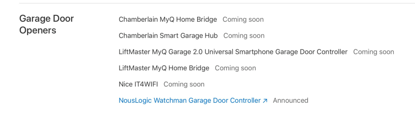 I counted 37 different accessories on this page that are listed as “Announced” or “Coming Soon”. In fact the entire Garage Door category is full of products that don’t actually support HomeKit yet! THE ENTIRE CATEGORY!